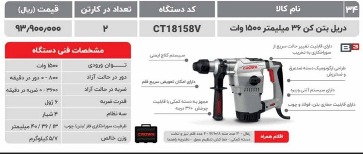دریل بتن کن۳۶ میلیمتر ۱۵۰۰ وات کد ۱۸۱۵۸ کرون