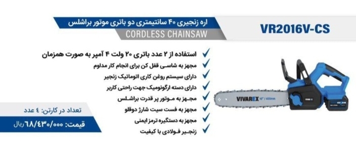 اره زنجیری شارژی 40 سانت براشلس دو باتری ویوارکس مدل VR2016V-CS